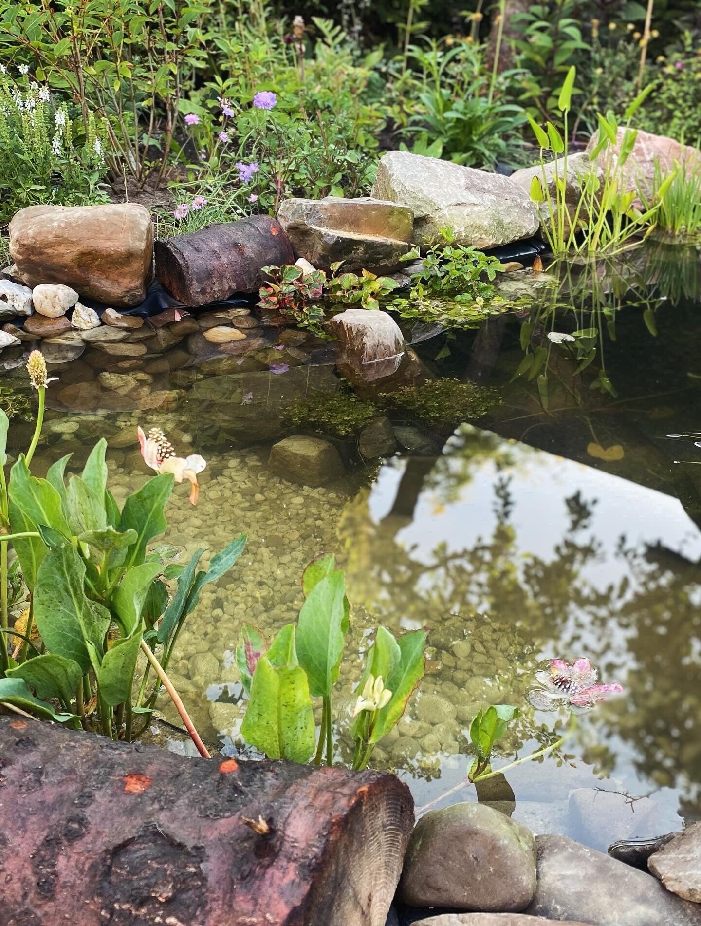 foto: Een natuurlijke vijver heeft geen filter nodig en houdt zichzelf in stand. Met het boek 'Kikkers en vijvers' van Ada Hofman als raadgever is het Lisette al meerdere keren gelukt om een kraakheldere vijver aan te leggen waar veel kikkers en libellen op afkomen. Maar ook vogels en bijen die er graag uit komen drinken. Aanleg juli 2025.