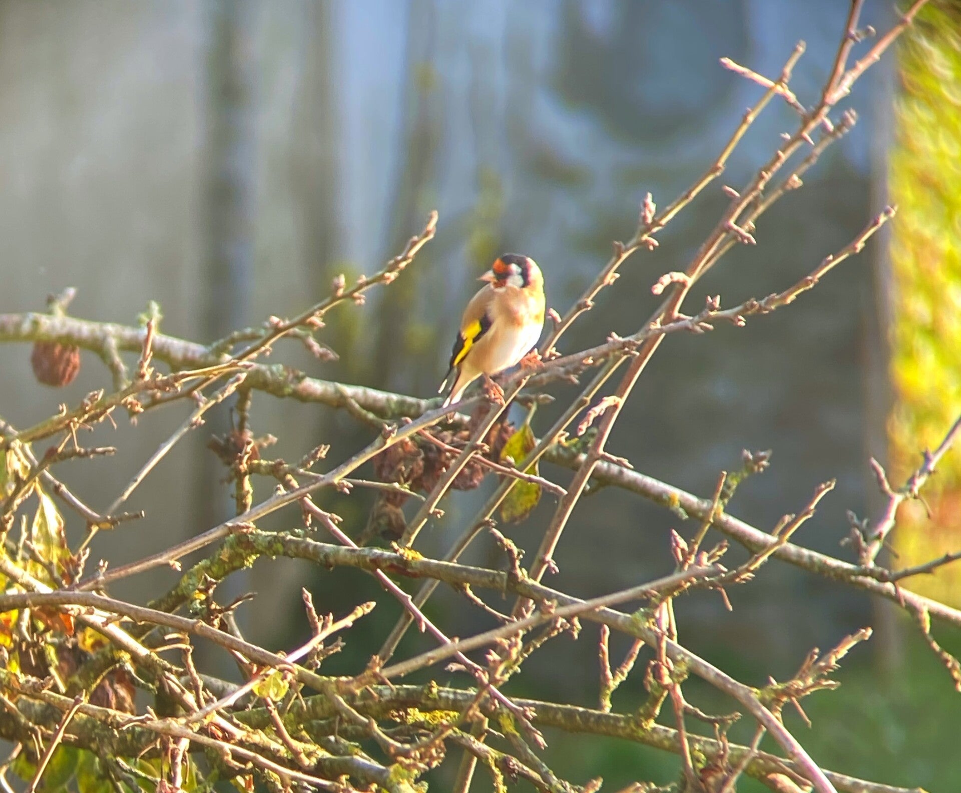 foto: er is een grote kans dat je putters in je tuin ziet als je uitgebloeide Zonnebloemen en Kaardenbol laat staan. Hier een Putter op de oude Pruimenboom in onze tuin.